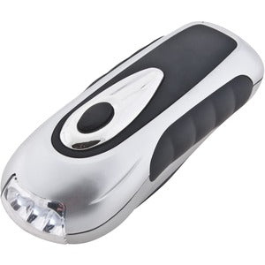 Marketing Information | Windup, three-beam LED flashlight does not run on batteries. Simply wind up or pump the handle for light when you need it. Flashlight has a two-position switch for high and low beams. |