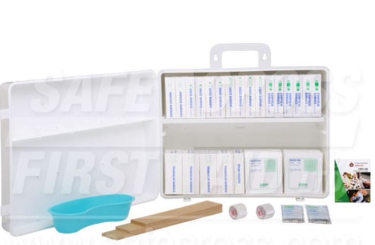 Exceeds Ontario Occupational Health and Safety requirement. Ideal for treating a full assortment of practical, single-use disposable products to treat injuries in a sanitary way. Complete with carrying case. Wall mountable.