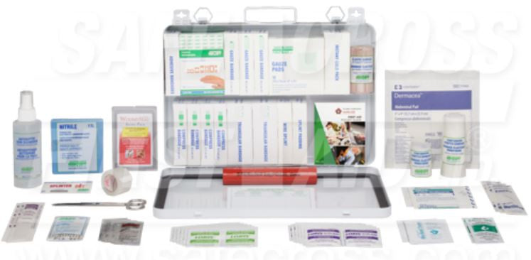 The Metal First Aid Kit includes: 1-Abdominal Pad, 12-Alcohol Swabs, 12-Bzk Towelettes, 1-Cold Pack, 4-Compress Bandages, 2-Stretch Bandages, 3- Cotton Tipped Applicators, 1- Elastic Support, 1-CPR Shield, 49-Fabric Bandages, 1-Inspection Card, 8-Ointments, 8-Gauze Bandage Rolls, 12-Gauze Pads, 2- Antiseptic Jel, 2-Waste Bags, 2Pk Disposable Nitrile Gloves, 24-Plastic Bandages, 3-Splint Assorted, 1-Pocket Guide, 1-Tape, 3- Telfa Pads, 2- Tongue Depressors, 6 Triangular Bandages w/ pins, 2-Water Jel, 1-WoundSeal, 1 Kidney Basin.