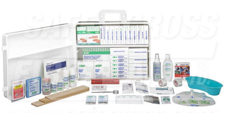 Marketing Information: | Meets Ontario Occupational Health and Safety Requirements. For 16 – 200 Employees. Wall-mountable. Contains;1-Abdominal Pad, 20-Alcohol Swabs, 1-Bzk Towelettes, 10 Butterfly Closures, 1-Cold Pack, 6-Compress Bandages, 4-Stretch Bandages, 6- Cotton Tipped Applicators, 1-CPR Shield, 6-Compression Bandage, 1-Basin, 50-Fabric Bandages, 1-Inspection Card, 8-Ointments, 28-Gauze Bandage Rolls, 50-Gauze Pads, 1- Antiseptic Jel, 2-Waste bags, 2Pk Disposable Nitrile Gloves, 75 Plastic Bandages, 4-Splint Assorted, 1-Pocket Guide, 2-Tape, 6-Telfa Pads, 4-Tongue Depressors, 12-Triangular Bandages w/ pins, 1 Kidney Basin. 2-Water Jel,1-WoundSeal,1-Scissor. |