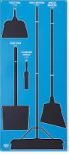 Shadow Board - 30" x 68" made from 1/4"/6mm thick Aluminum Composite Material (ACM) with a durable print finish and includes hanger hardware that is easily installed by the user. Includes signage for: Angle Broom,, Large Push Broom, Dust Pan, Counter Brush, Shovel.